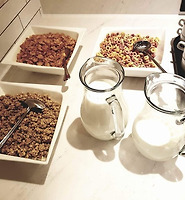 상단 좌측부터 우유, 망고 주스, 귤, 볶음밥, 씨리얼, 딸기잼, 버터, 스크램블 에그, 토마토 슬라이스, 양상추였어요.